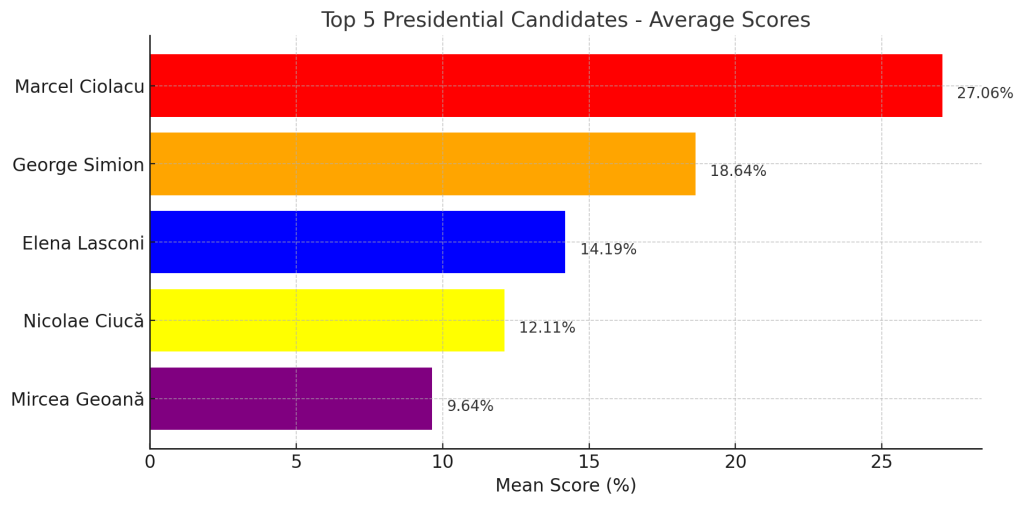 În urma unei analize comparative a acestor sondaje, am calculat scorurile medii ale principalilor candidați. Media reflectă mai bine situația generală a competiției și reduce impactul variațiilor metodologice între casele de sondare.